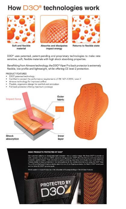 - מצויד במיגון גב תפור D3O LEVEL 2. פותח להגנה מפני פגיעות קשות